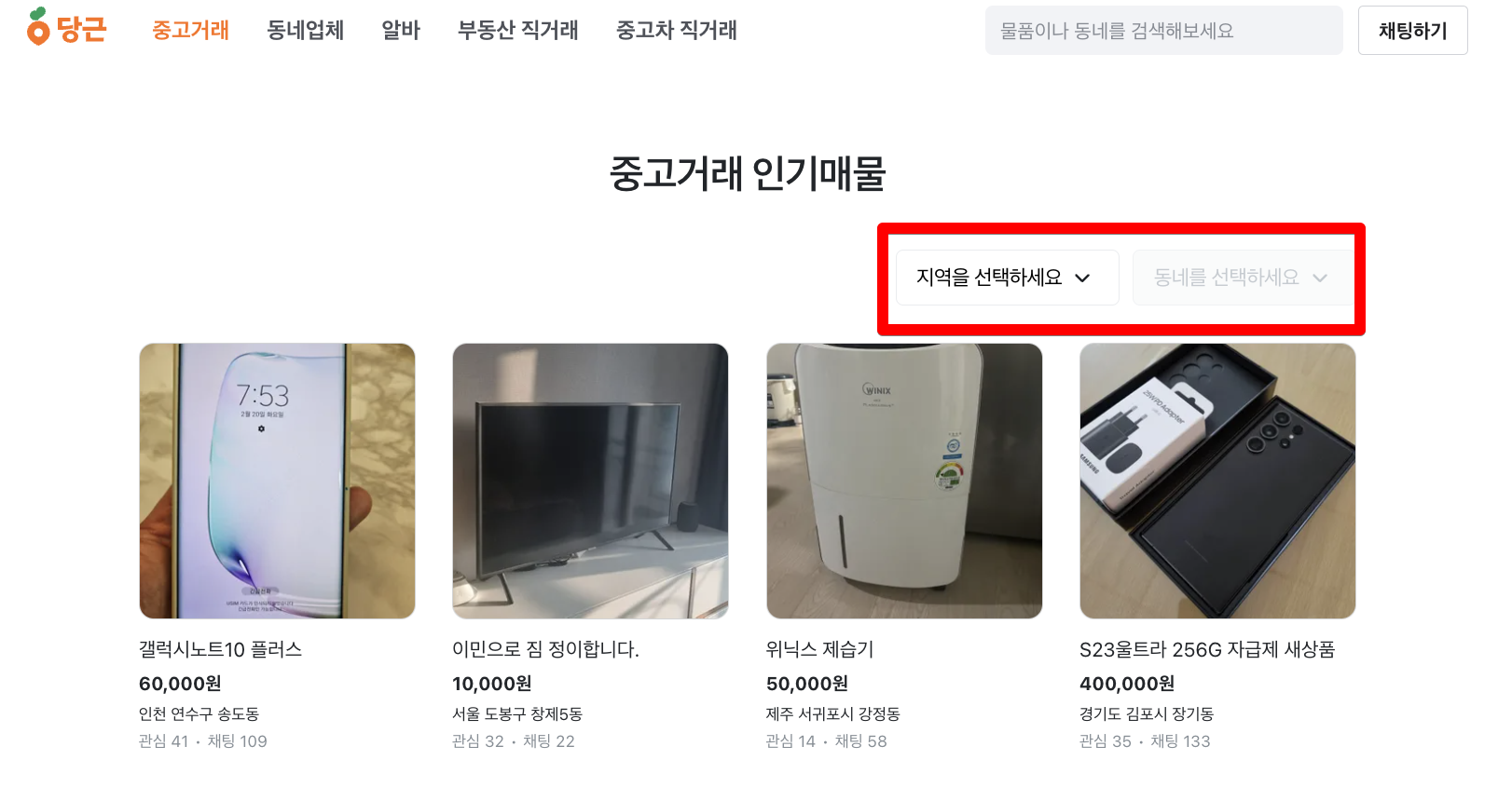 내가 살고 있는 지역 내에서 판매 중인 물건들을 살 수도 있고, 내 물건을 판매할 수도 있습니다.